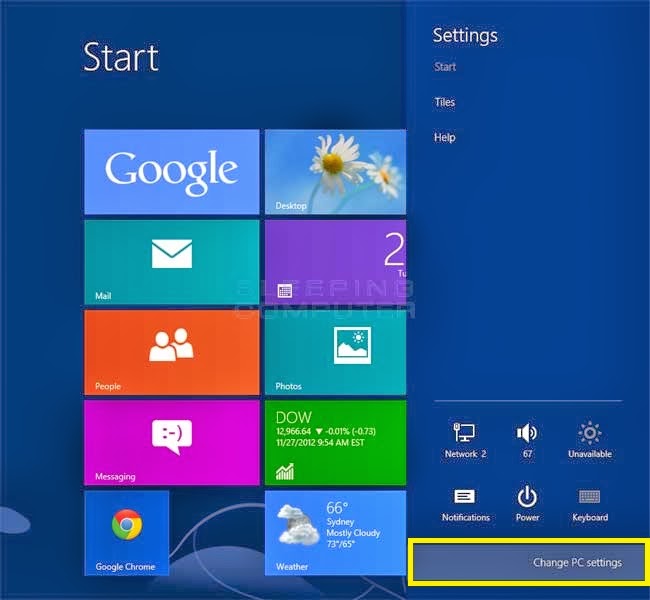 3. Pilih menu "Settings", lalu pilih "Change PC Settings" di bagian paling bawah.